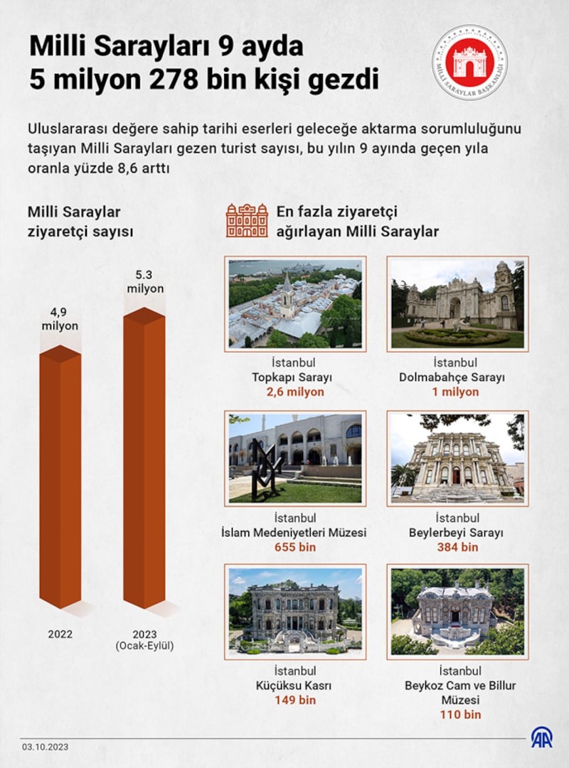 Yerli ve yabancı turistlerin ziyaretlerine açık olan Milli Sarayları gezen turist sayısı, bu yılın 9 ayında geçen yıla oranla yüzde 8,6 artışla 5 milyon 278 bin 177’ye yükseldi.