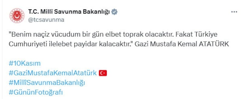Milli Savunma Bakanlığı, 10 Kasım Atatürk'ü Anma Günü nedeniyle sosyal medya hesabından anlamlı bir kare paylaştı.