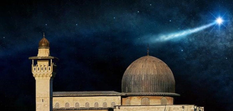 “Kulunu (Muhammed aleyhisselamı) bir gece, Mescid-i Harâm’dan kendisine bâzı âyetlerimizi göstermek için, etrâfını mübârek kıldığımız Mescid-i Aksâ’ya götüren Allâh, her türlü noksan sıfatlardan münezzehtir. Şüphesiz O, her şeyi hakkıyla bilen, hakkıyla görendir.” (İSRA SURESİ-1)