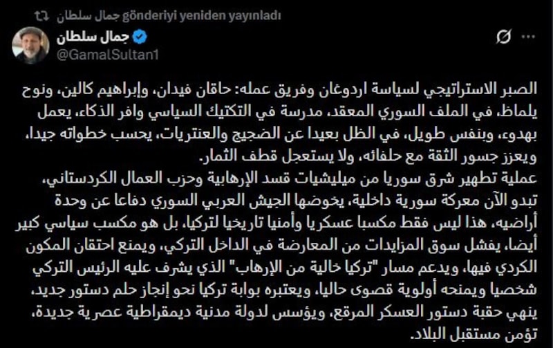 Sultan, Cumhurbaşkanı Recep Tayyip Erdoğan ve ekibinin Suriye dosyasında “stratejik sabır, sessiz diplomasi ve dikkatle hesaplanmış adımlar” izlediğini belirterek, bunun bir “siyasî taktik okulu” niteliği taşıdığını ifade etti.