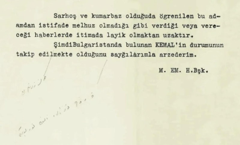 - Sarhoş ve kumarbaz olduğu da öğrenilen bu adamdan istifade melhuz olmadığı gibi verdiği veya vereceği haberler de itimada layık olmaktan uzaktır. Şimdi Bulgaristan'da bulunan Kemal'in durumunun takip edilmekte olduğunu saygılarımla arz ederim."