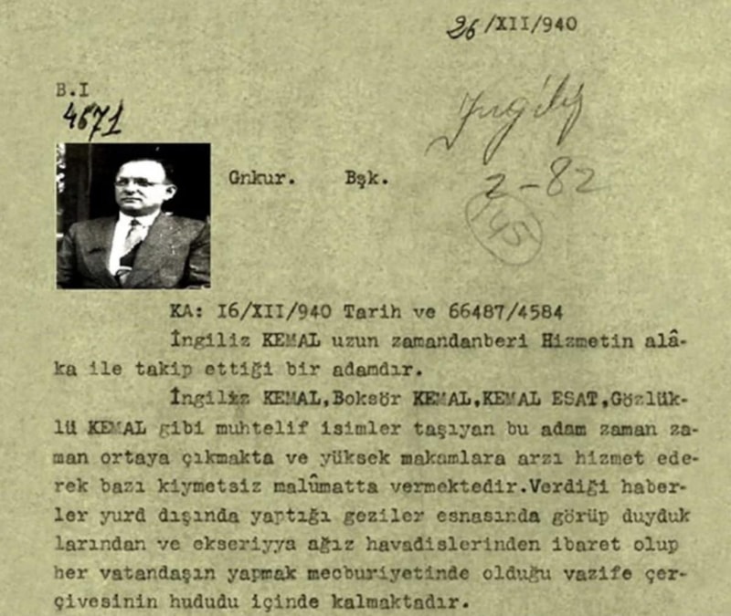 "- İngiliz Kemal uzun zamandan beri hizmetin alaka ile takip ettiği bir adamdır. İngiliz Kemal', 'Boksör Kemal', 'Kemal Esat', 'Gözlüklü Kemal' gibi muhtelif isimler taşıyan bu adam zaman zaman ortaya çıkmakta ve yüksek makamlara arzı hizmet ederek bazı kıymetsiz malumatlar vermektedir.