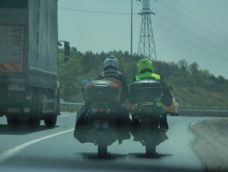 Emniyet şeridinden ilerleyen motosikletliler, kamyonların arasında adeta tehlikeye davetiye çıkardı. Bir süre yan yana ilerleyen motosikletliler, daha sonra gözden kayboldu.