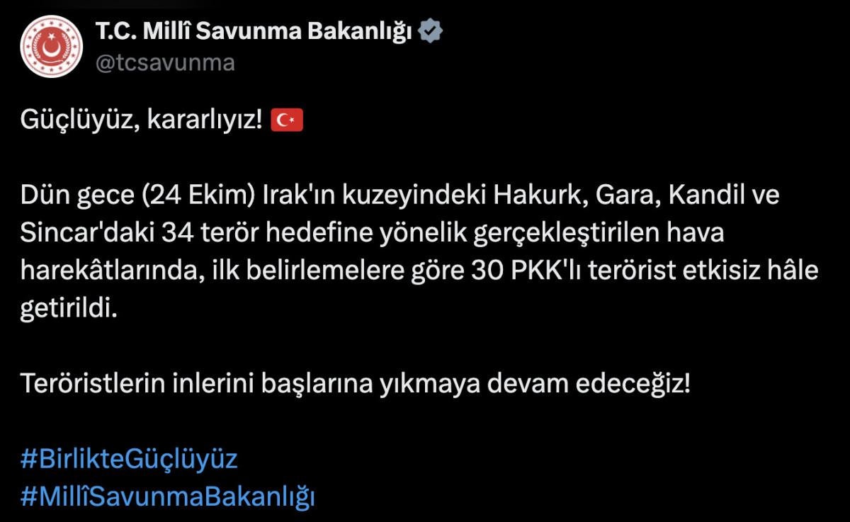 Dün gece (24 Ekim) Irak'ın kuzeyindeki Hakurk, Gara, Kandil ve Sincar'daki 34 terör hedefine yönelik gerçekleştirilen hava harekâtlarında, ilk belirlemelere göre 30 PKK'lı terörist etkisiz hâle getirildi.