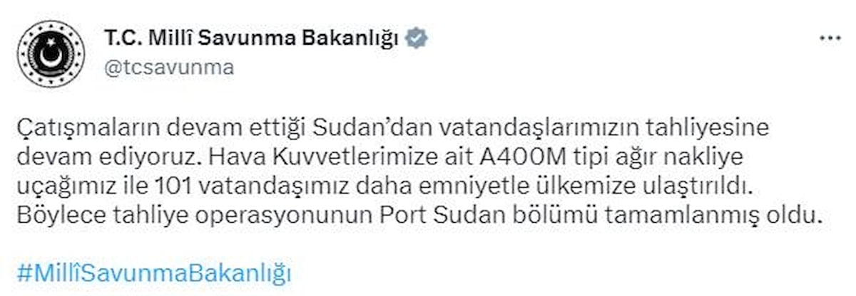 Çatışmaların devam ettiği Sudan’dan vatandaşlarımızın tahliyesine devam ediyoruz. Hava Kuvvetlerimize ait A400M tipi ağır nakliye uçağımız ile 101 vatandaşımız daha emniyetle ülkemize ulaştırıldı. Böylece tahliye operasyonunun Port Sudan bölümü tamamlanmış oldu.