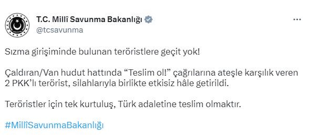 Çaldıran/Van hudut hattında “Teslim ol!” çağrılarına ateşle karşılık veren 2 PKK’lı terörist, silahlarıyla birlikte etkisiz hale getirildi.