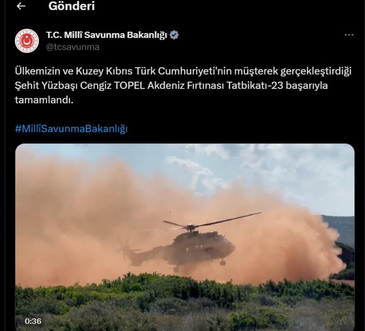 Ülkemizin ve Kuzey Kıbrıs Türk Cumhuriyeti'nin müşterek gerçekleştirdiği Şehit Yüzbaşı Cengiz TOPEL Akdeniz Fırtınası Tatbikatı-23 başarıyla tamamlandı.