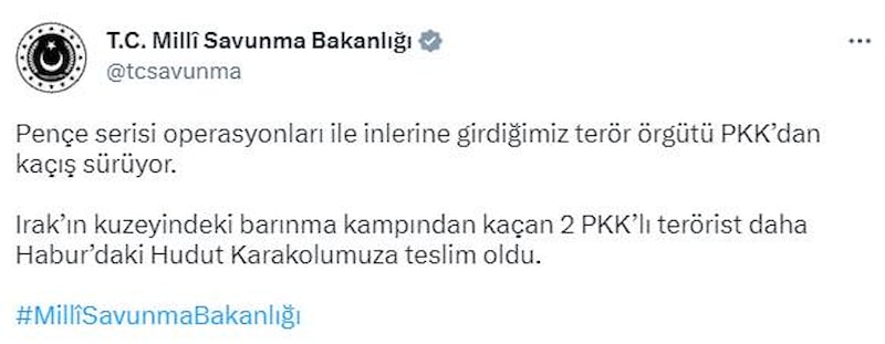 Milli Savunma Bakanlığı, Irak’ın barınma kampından kaçan 2 PKK’lı teröristin, Habur’da güvenlik güçlerine teslim olduğunu açıkladı.
