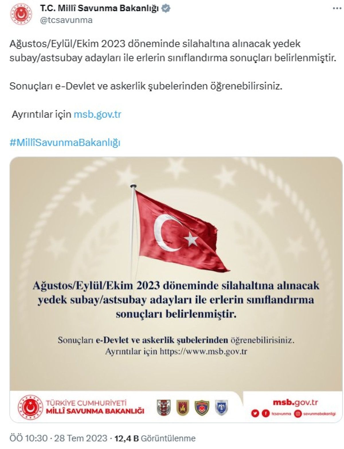 Milli Savunma Bakanlığı (MSB), 2023 Ağustos, Eylül ve Ekim döneminde askere alınacak yedek, subat ve astsubay adayları ile erlerin sınıflandırma sonuçlarının açıklandığını duyurdu.