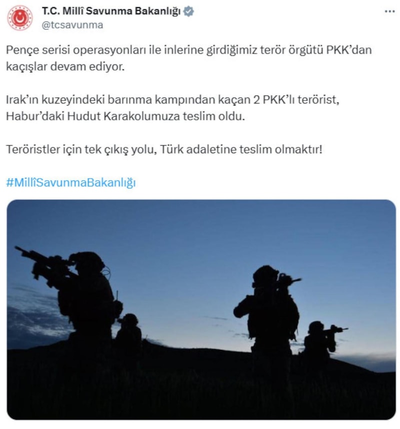 Milli Savunma Bakanlığı tarafından yapılan açıklamada, Irak'ın kuzeyindeki barınma alanlarından kaçan 2 PKK'lı teröristin Habur'daki hudut karakoluna teslim olduğu belirtildi.