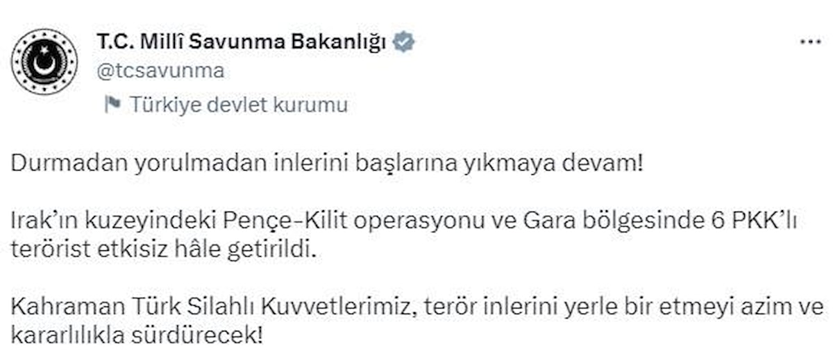 Irak’ın kuzeyindeki Pençe-Kilit operasyonu ve Gara bölgesinde 6 PKK’lı terörist etkisiz hâle getirildi.