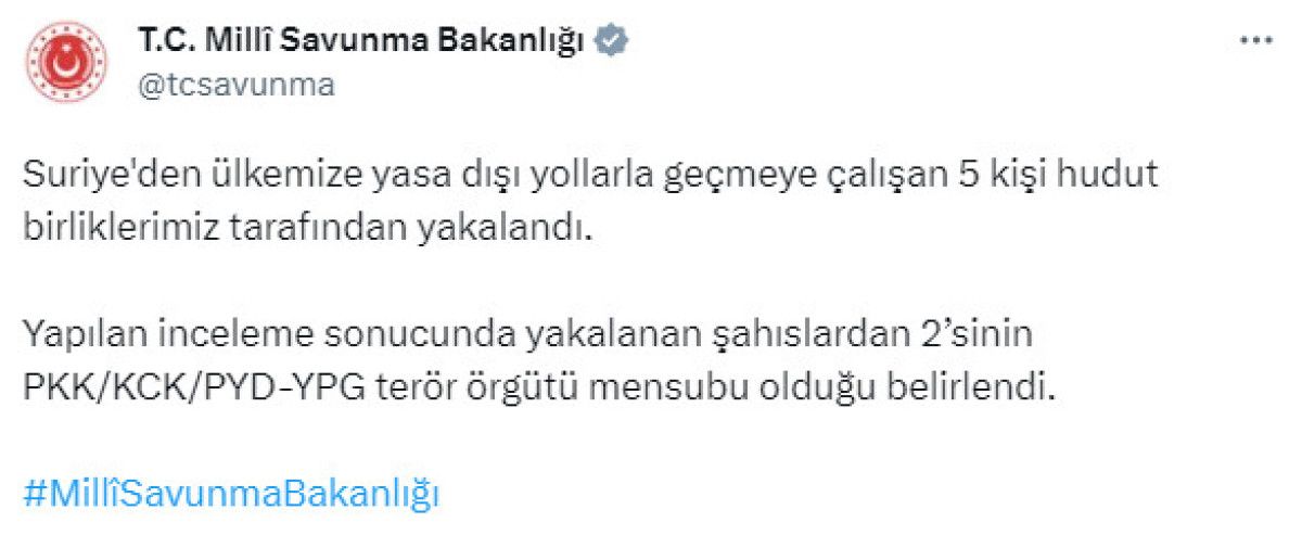 Suriye'den ülkemize yasa dışı yollarla geçmeye çalışan 5 kişi hudut birliklerimiz tarafından yakalandı.