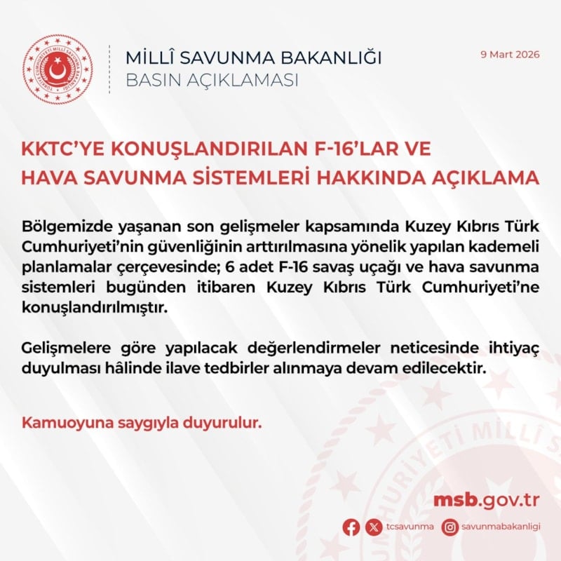 "Bölgemizde yaşanan son gelişmeler kapsamında Kuzey Kıbrıs Türk Cumhuriyeti'nin güvenliğinin artırılmasına yönelik yapılan kademeli planlamalar çerçevesinde; 6 adet F-16 savaş uçağı ve hava savunma sistemleri bugünden itibaren Kuzey Kıbrıs Türk Cumhuriyeti'ne konuşlandırılmıştır.