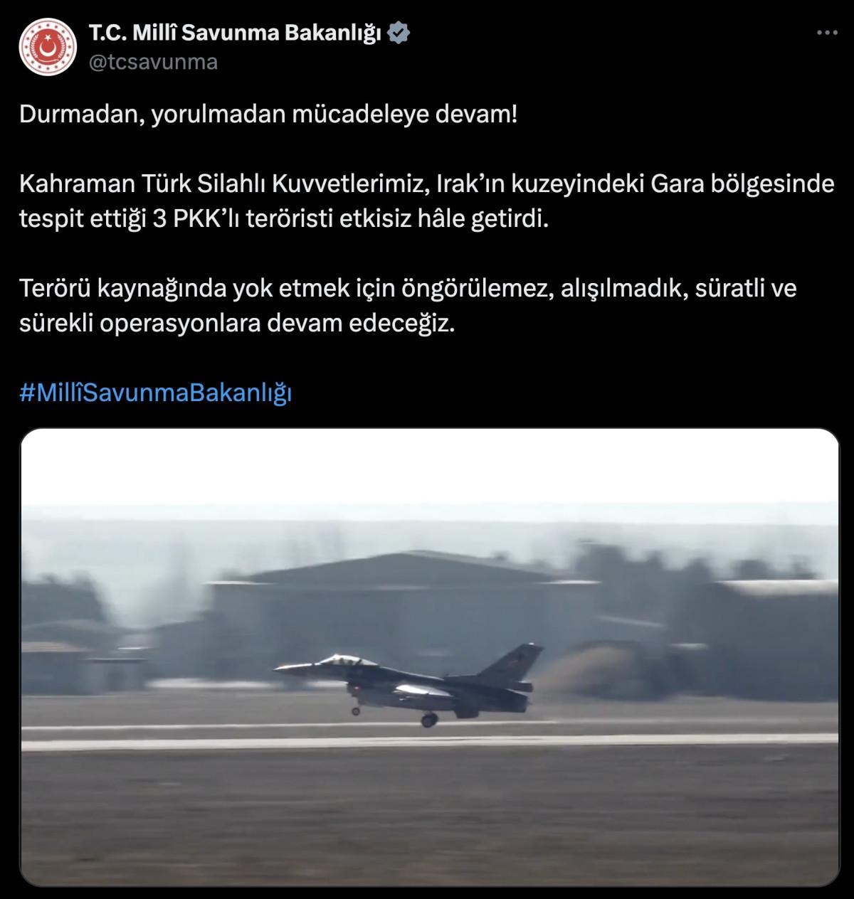 Milli Savunma Bakanlığı'ndan (MSB) yapılan açıklamada, 3 PKK'lının etkisiz hale getirildiği açıklandı.
