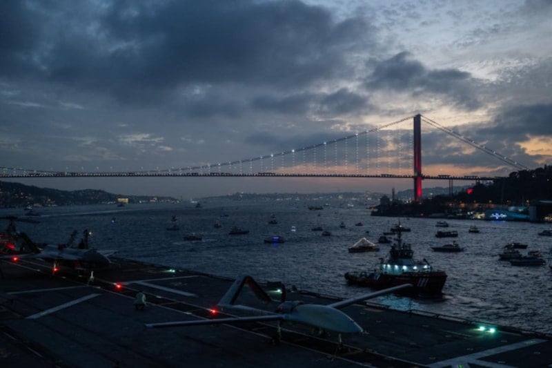 100. yıl kapsamında tarihte ilk kez İstanbul Boğazı'ndan savaş gemileri geçiş yaparak, Cumhurbaşkanı Recep Tayyip Erdoğan'ı ve halkı selamladı.