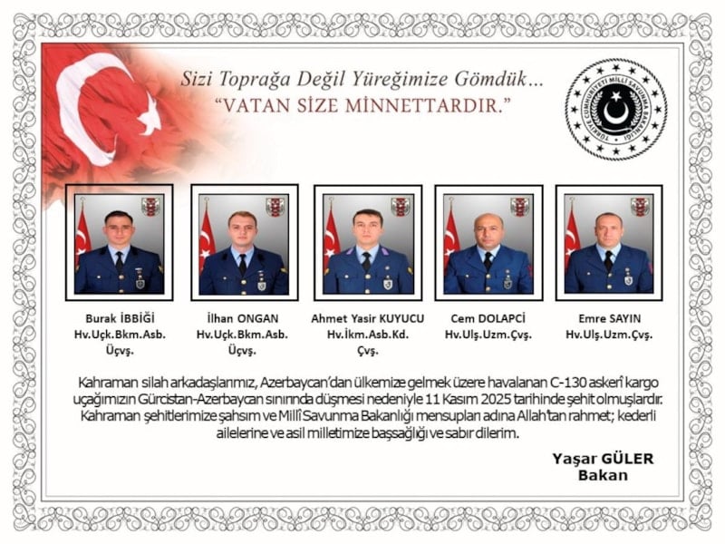 "Kahraman silah arkadaşlarımız, Azerbaycan'dan ülkemize gelmek üzere havalanan C130 askeri kargo uçağımızın Gürcistan-Azerbaycan sınırında düşmesi nedeniyle 11 Kasım 2025 tarihinde şehit olmuşlardır.