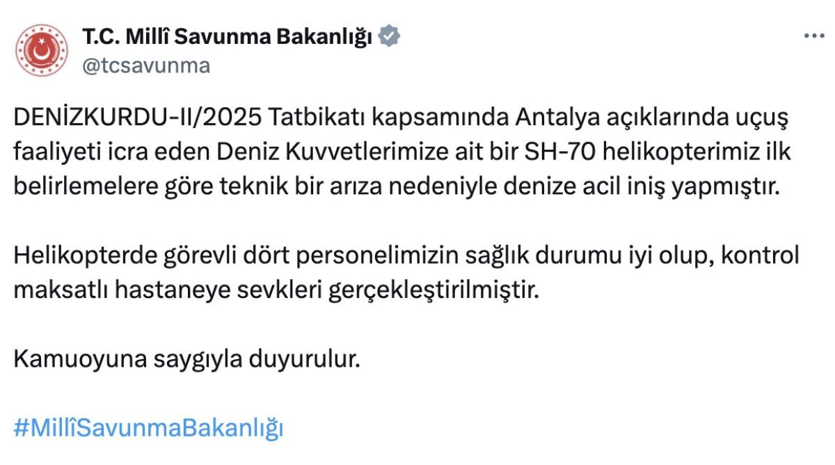 DENİZKURDU-II/2025 Tatbikatı kapsamında Antalya açıklarında uçuş faaliyeti icra eden Deniz Kuvvetlerimize ait bir SH-70 helikopterimiz ilk belirlemelere göre teknik bir arıza nedeniyle denize acil iniş yapmıştır.