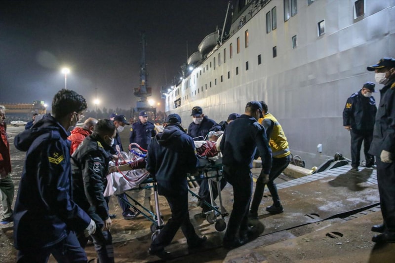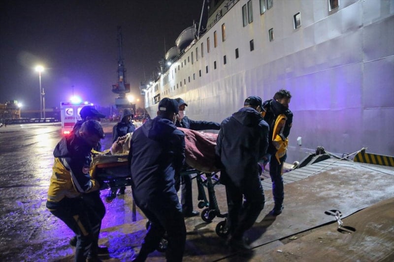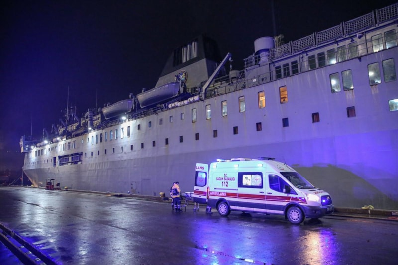 Limana ambulanslarla sevk edilen yaralılar, ekiplerce gemiye alınmaya başlandı.