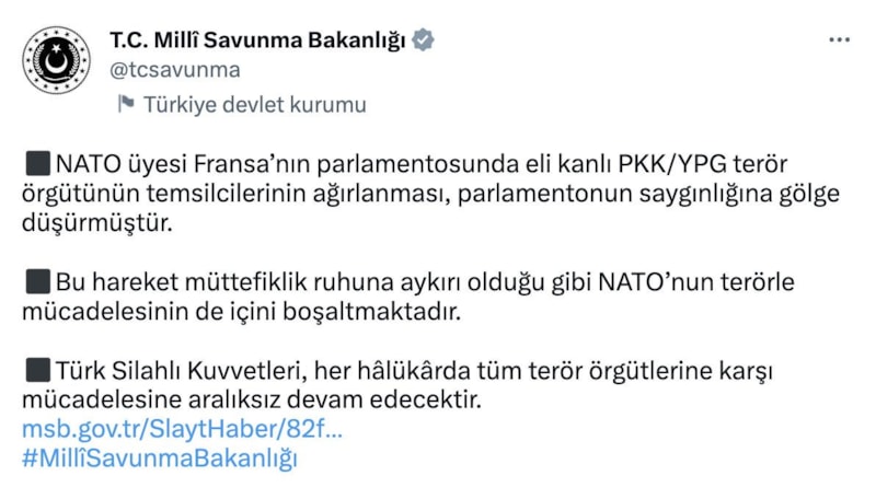 Milli Savunma Bakanlığı (MSB), PKK/YPG'lilerin Fransa Senatosunda ağırlanmasına tepki gösterdi.