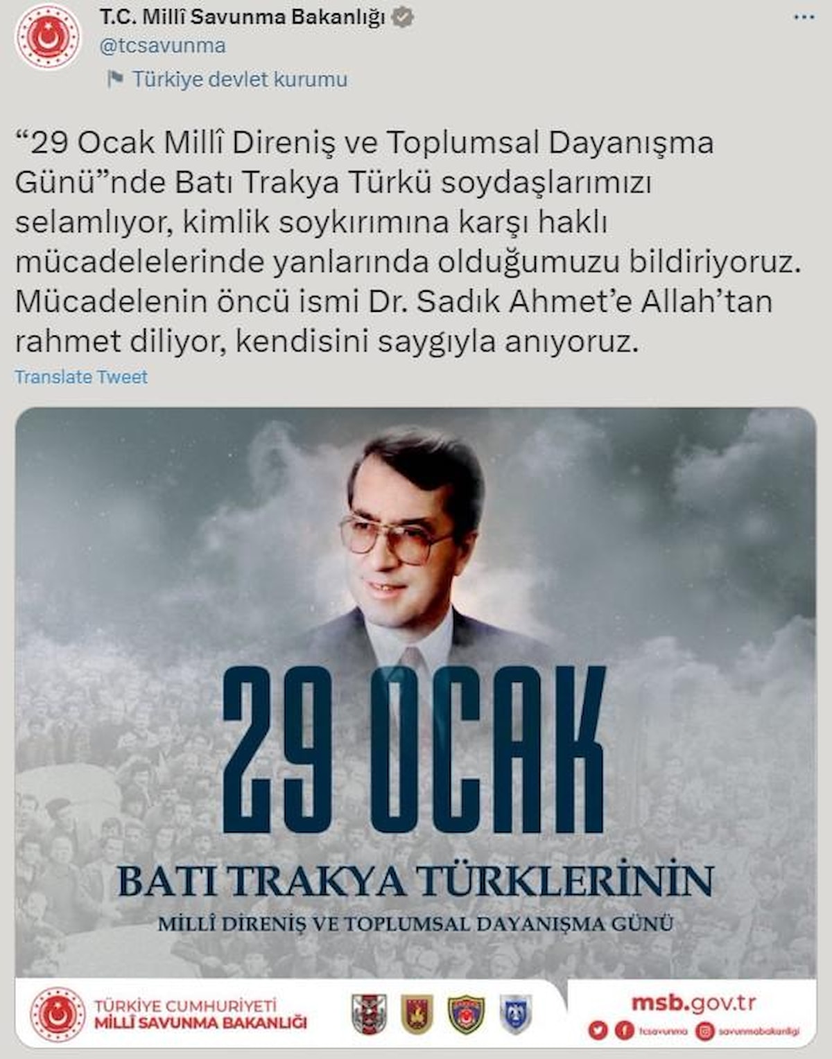 Milli Savunma Bakanlığı, Batı Trakya davasının sembol ismi haline gelen Ahmet'i andı.