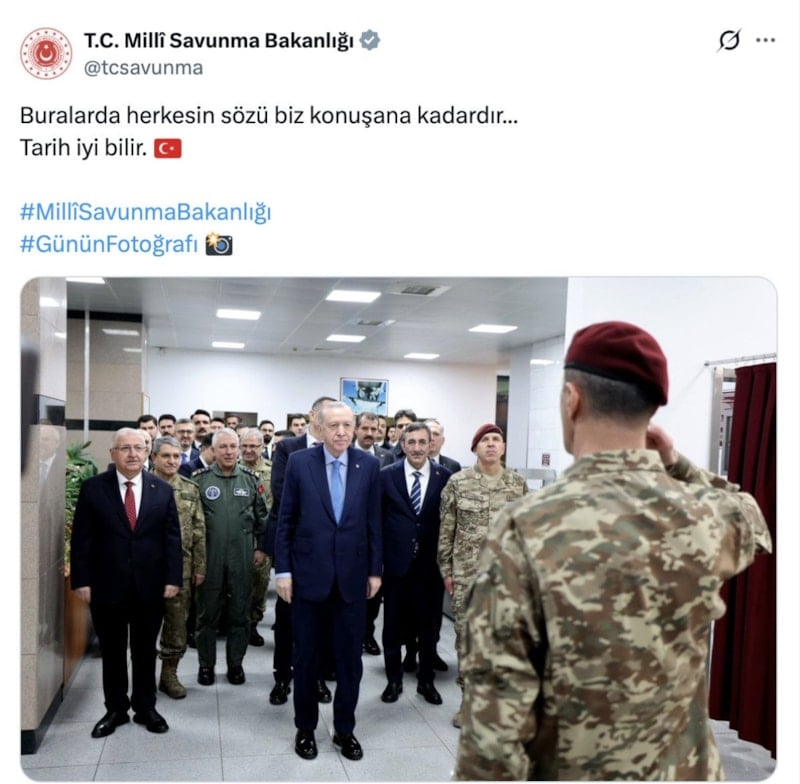 Milli Savunma Bakanlığı (MSB), Cumhurbaşkanı Recep Tayyip Erdoğan'ın bulunduğu bir kareyi "Buralarda herkesin sözü biz konuşana kadardır. Tarih iyi bilir." notuyla paylaştı.