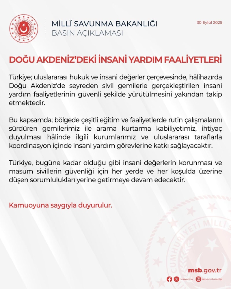 Milli Savunma Bakanlığı, Doğu Akdeniz'deki insani yardım faaliyetlerine ilişkin yaptığı açıklamada, "Türkiye; uluslararası hukuk ve insani değerler çerçevesinde, halihazırda Doğu Akdeniz'de seyreden sivil gemilerle gerçekleştirilen insani yardım faaliyetlerinin güvenli şekilde yürütülmesini yakından takip etmektedir.