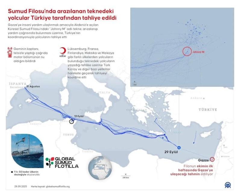 Bu kapsamda da Küresel Sumud Filosu'ndaki 'Johnny M' adlı teknenin su alarak arızalanıp yardım çağrısında bulunması üzerine yolcular, Türkiye'nin koordinasyonuyla dün sabah saatlerinde tahliye edilmişti.
