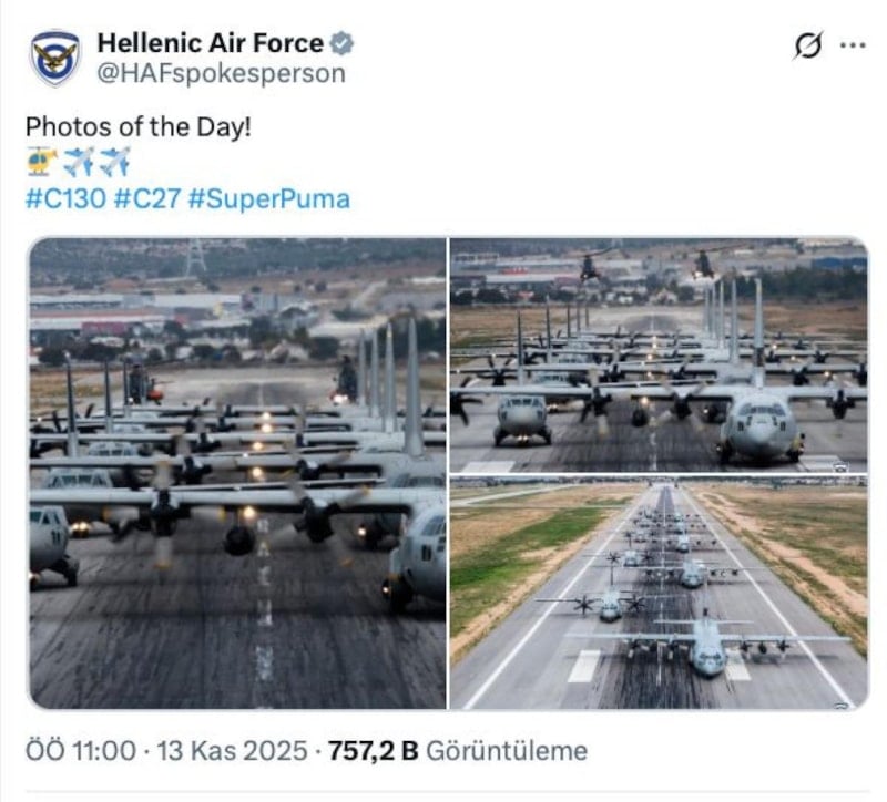 Şehitlerin naaşları Türkiye’ye ulaşırken, Yunanistan Hava Kuvvetleri’nin resmi sosyal medya hesabı X üzerinden yapılan paylaşım büyük tepki çekti. Hesaptan, C-130 filosunun görselleriyle birlikte “Günün Fotoğrafları! #C130 #C27 #SuperPuma” notu düşüldü.