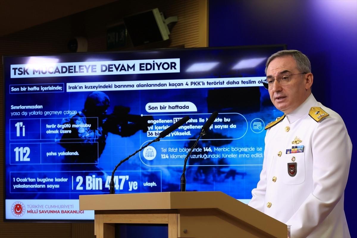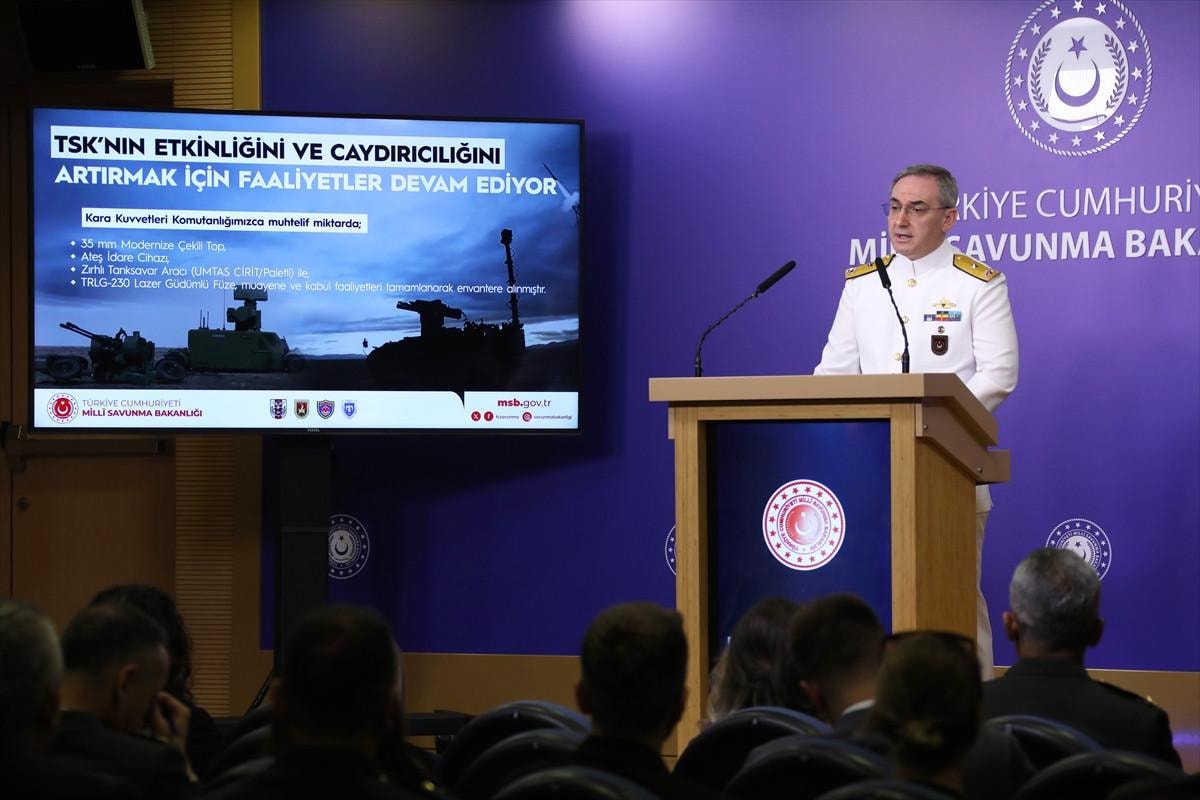 Milli Savunma Bakanlığı (MSB), Türk Silahlı Kuvvetleri'nin terörle mücadele, sınır güvenliği, savunma altyapısının güçlendirilmesi ve uluslararası iş birlikleri kapsamında yürüttüğü çalışmalara ilişkin son gelişmeleri kamuoyuyla paylaştı. MSB Basın ve Halkla İlişkiler Müşaviri Tuğamiral Zeki Aktürk, Bakanlık binasında düzenlenen haftalık basın bilgilendirme toplantısında önemli açıklamalarda bulundu.