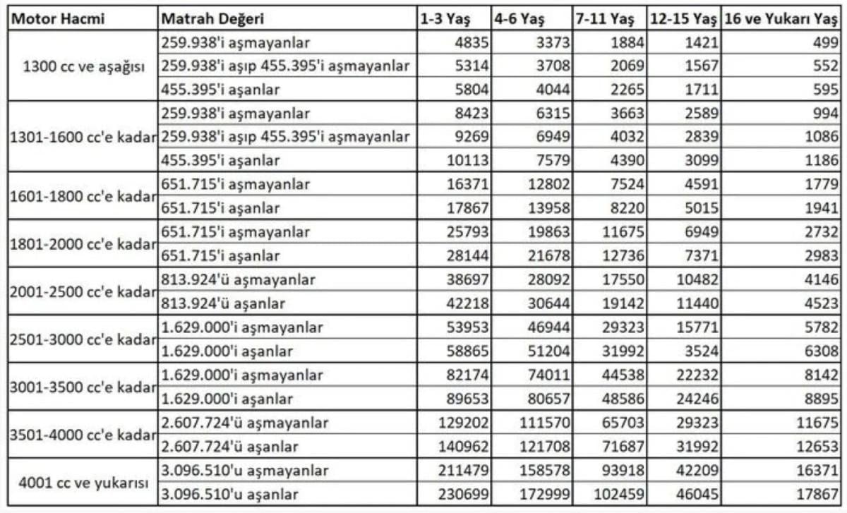 Taşıt değerlerinin en üst limitte olduğu tabloya göre, 2025 yılında motor silindir hacmi 1.3 litreye kadar otomobillerden alınacak MTV tutarı 4 bin 33 TL’den 5 bin 803 TL’ye çıkacak.
