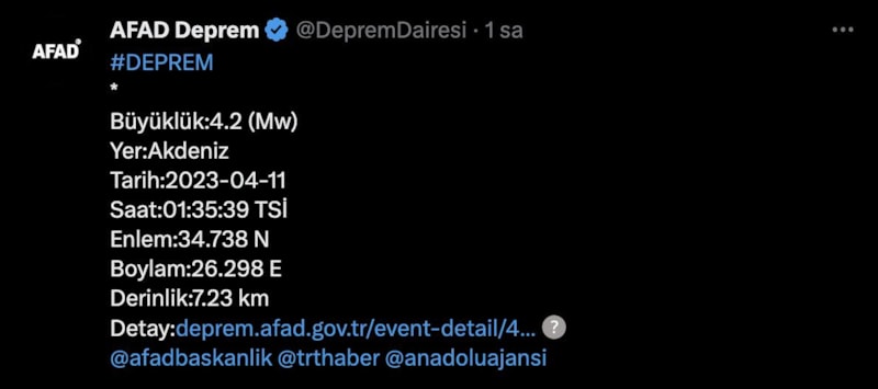 Afet ve Acil Durum Yönetimi Başkanlığı'nın (AFAD) açıklamasına göre Akdeniz'de saat 01.35'te 4.2 büyüklüğünde bir sarsıntı yaşandı.
