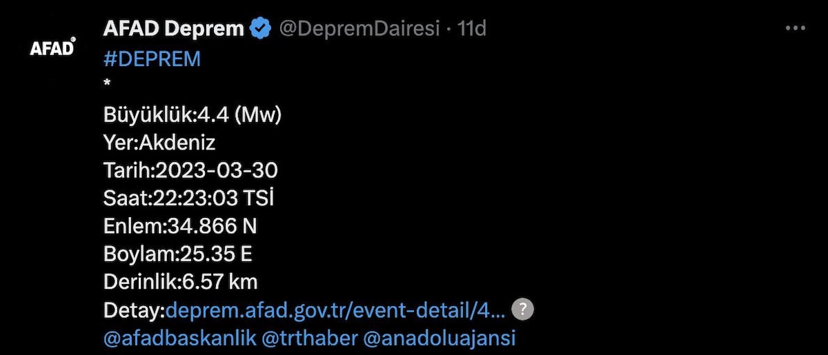 Afet ve Acil Durum Yönetimi Başkanlığı'nın (AFAD) açıklamasına göre Akdeniz'de saat 22.23'te 4.4 büyüklüğünde bir sarsıntı yaşandı.