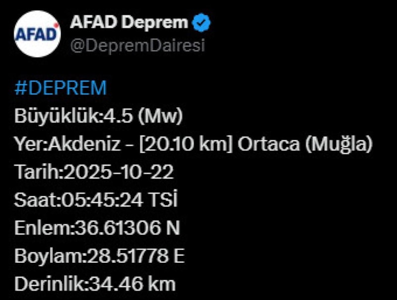 AFAD'dan yapılan açıklamaya göre Muğla'nın Ortaca ilçesi açıklarında saat 05.45'te 4.5 büyüklüğünde deprem oldu.