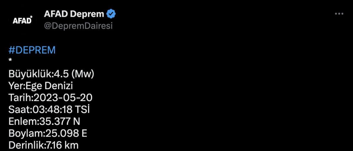 Afet ve Acil Durum Yönetimi Başkanlığı'nın (AFAD) açıklamasına göre Ege Denizi'nde saat 03.48'de 4.5 büyüklüğünde bir sarsıntı yaşandı.