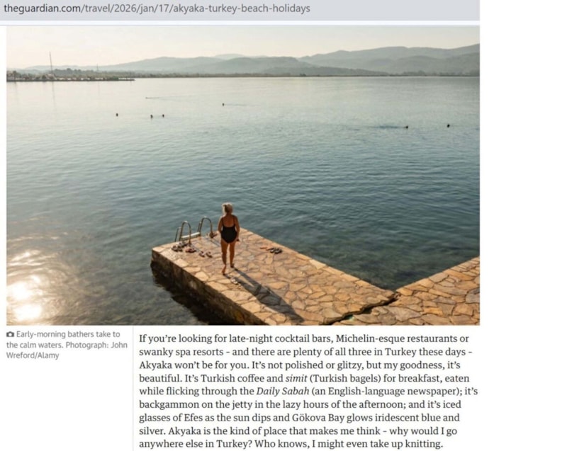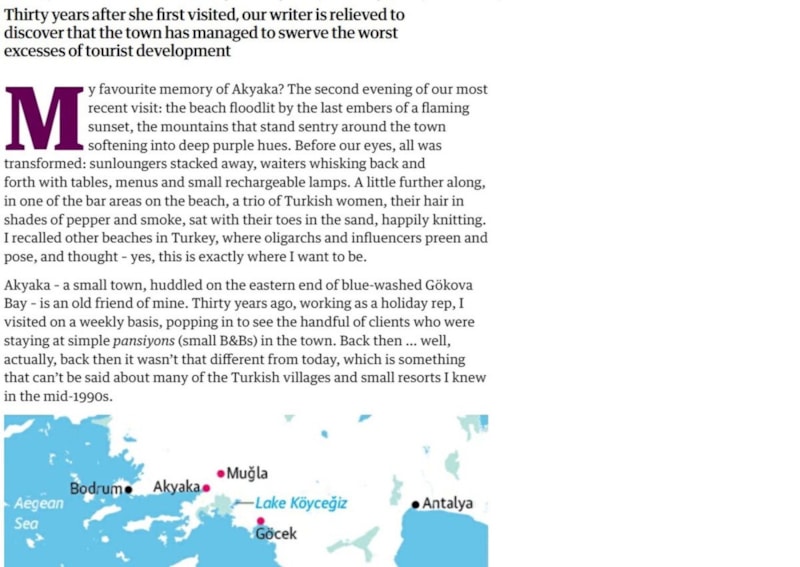 İngiliz The Guardian'da köşe yazarı Annabelle Thorpe, kaleme aldığı yazısında Akyaka Mahallesi'ni, gösterişten uzak yapısı, yavaş yaşam temposu ve doğayla kurduğu güçlü bağ sayesinde kitlesel turizme direnen ender sahil kasabalarından biri olarak tanımladı.