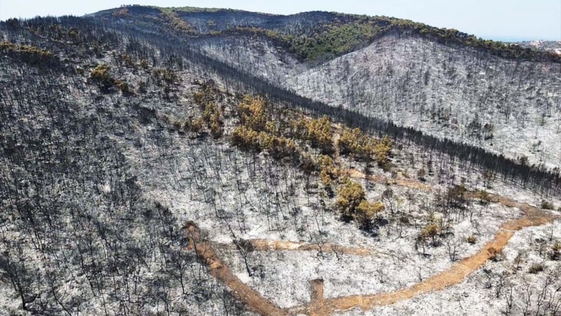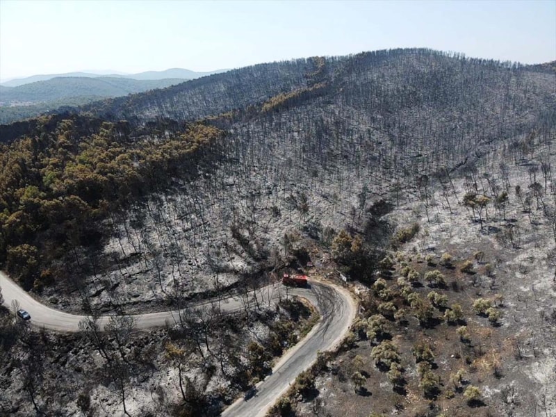 Görüntülerde, yanan alanlar ve orman söndürme işçilerinin bölgede halen yürüttüğü soğutma çalışmaları da yer aldı.