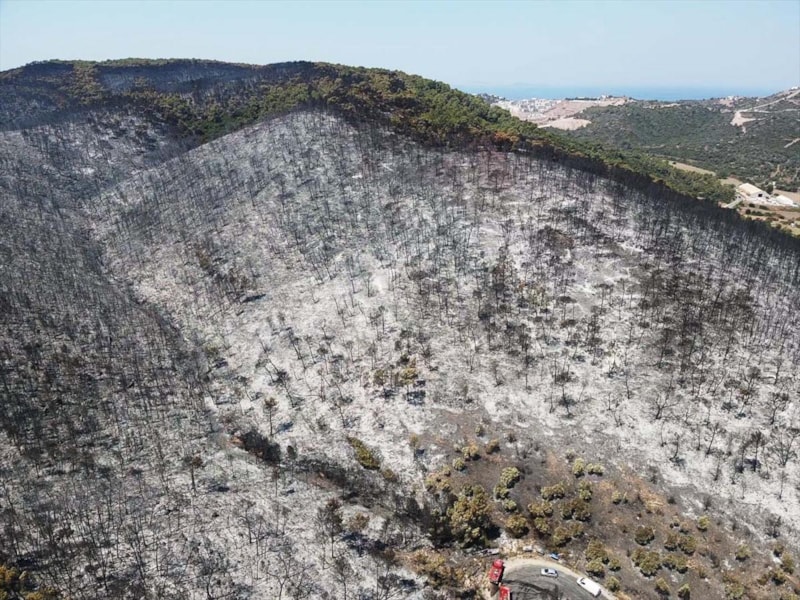 Kentte dün henüz belirlenemeyen bir nedenle başlayan yangını söndürme çalışmaları saatler sürdü. Kontrol altına alınan alevlerin ardından ormanlık alan havadan görüntülendi.