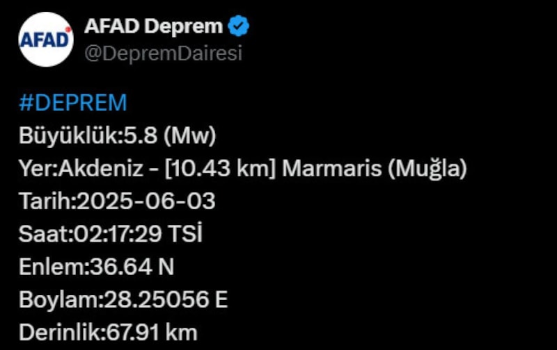 Akdeniz, Muğla Marmaris açıklarında saat 02.17'de meydana gelen; Muğla, Aydın, Denizli, Manisa ve İzmir illerimizde hissedilen 5.8 büyüklüğündeki deprem sonrası an itibarıyla olumsuz bir durum bulunmamaktadır. Saha tarama çalışmaları devam etmektedir. Etkilenen vatandaşlarımıza geçmiş olsun dileklerimizi sunarız.