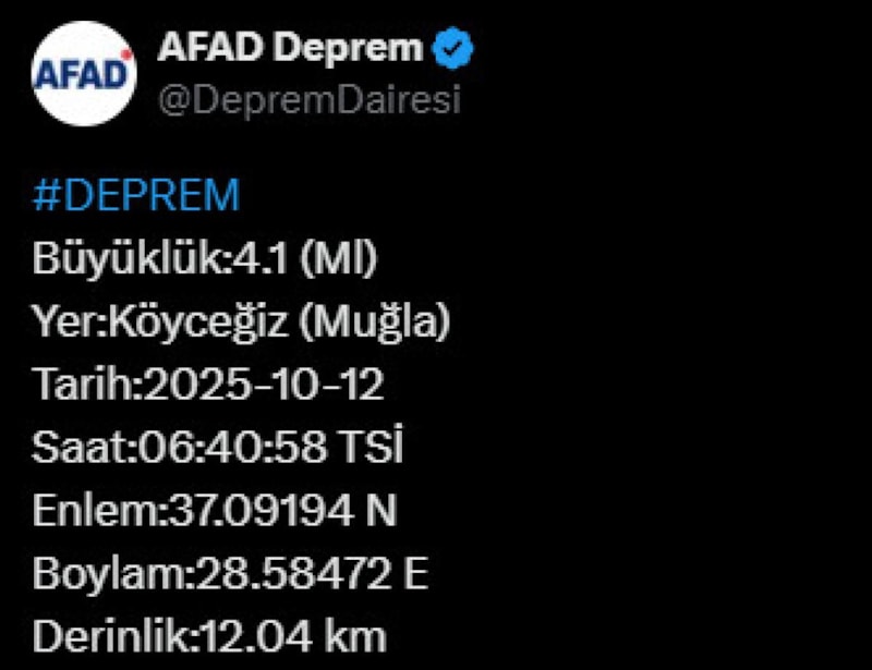 Afet ve Acil Durum Yönetimi Başkanlığı'nın internet sitesinde yer alan bilgiye göre saat 06.40'ta merkez üssü Köyceğiz ilçesi olan 4.1 büyüklüğünde sarsıntı kaydedildi.