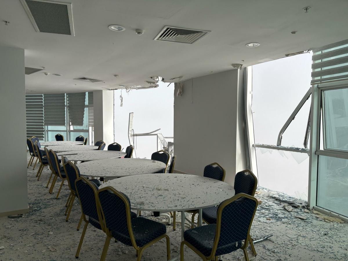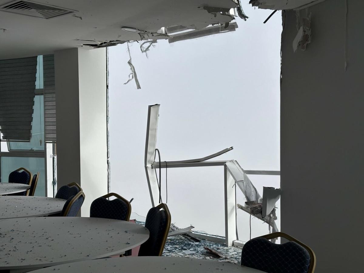 Öte yandan, helikopterin çarptığı ve toplantı salonunun bulunduğu en üst katta camların kırıldığı ve hasar oluştuğu görüldü.