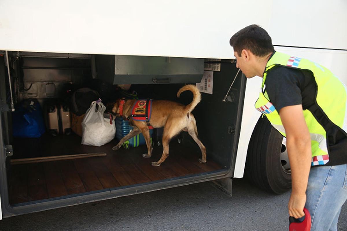 Denetimlerde uyuşturucu arama köpeği "Efor" da bazı araçlar üzerinde arama yaptı.