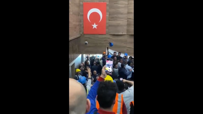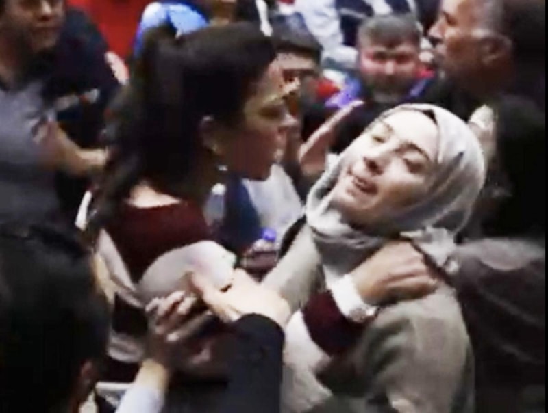 Erkek sendika üyelerinin arasında kalan genç kadın muhabire bu defa gelen işçiler arasında yer alan bir kadın tarafından fiziki saldırı yapılarak boğazı sıkıldı.