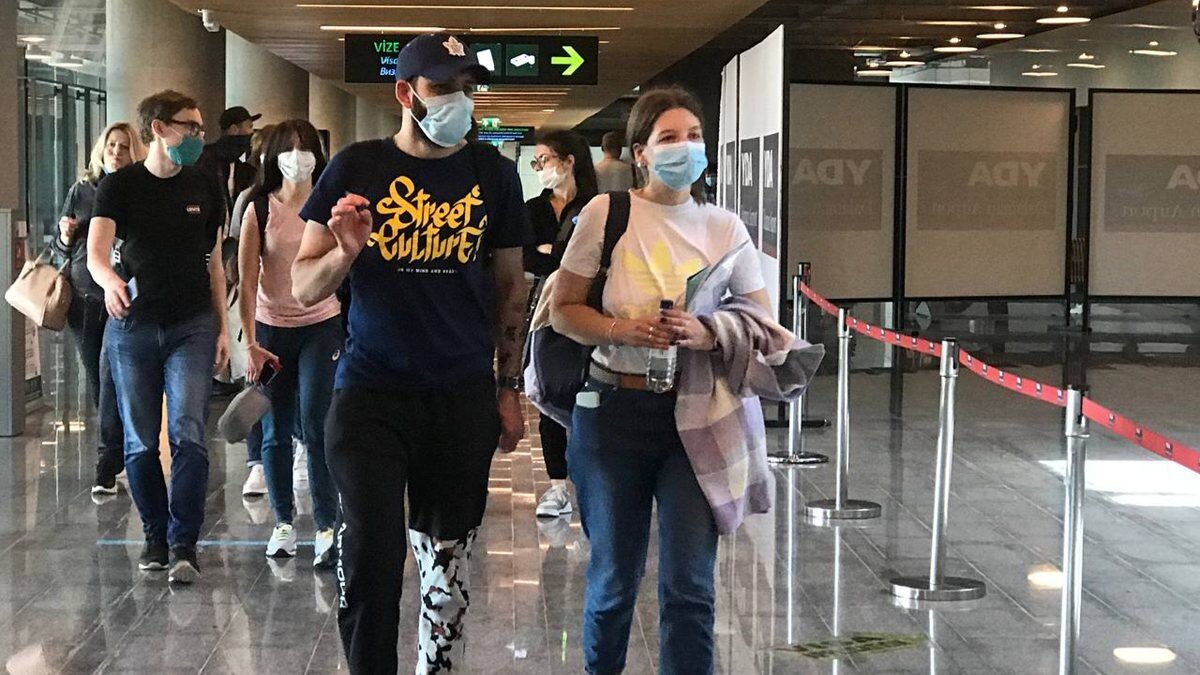 Uçaktan iniş sonrası pasaport işlemleri için gişelere yönelen Ukraynalı turistler 112 Sağlık ekipleri tarafından sabit cihaz ile ateşleri ölçüldü.