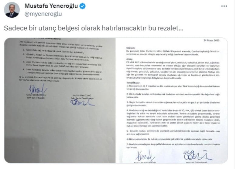 Paylaşılan metni alıntılayan DEVA Partili Mustafa Yeneroğlu, Kılıçdaroğlu için "Sadece bir utanç belgesi olarak hatırlanacaktır bu rezalet" ifadelerini kullandı.