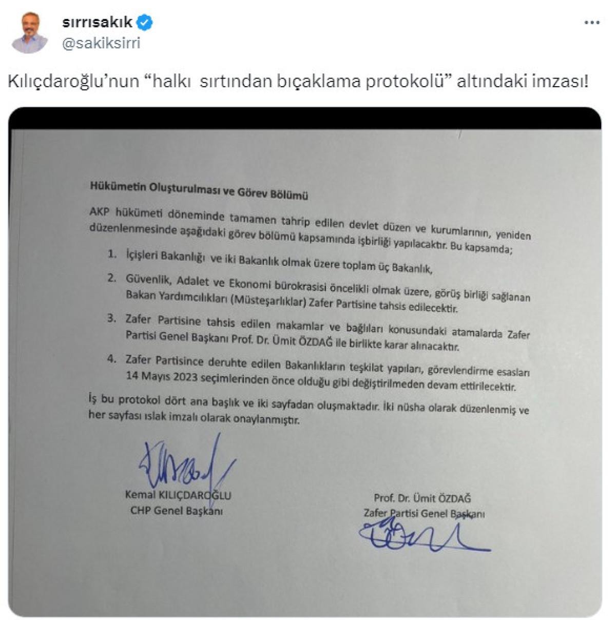 X hesabından paylaşımda bulunan Sakık, "Kılıçdaroğlu'nun halkı sırtından bıçaklama protokolü altındaki imzası" açıklamasıyla hayal kırıklığını bir kez daha dile getirdi.