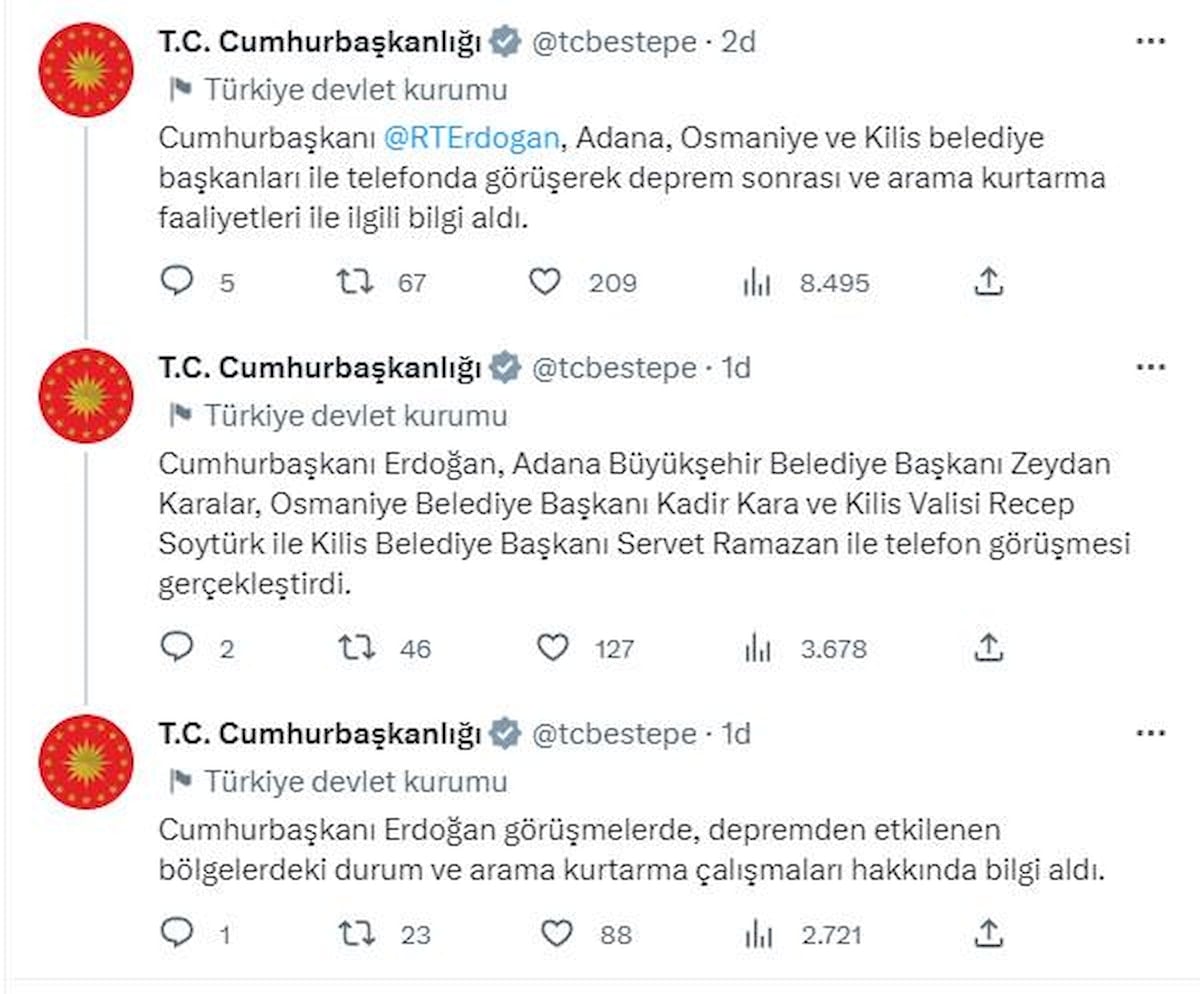 Cumhurbaşkanı Recep Tayyip Erdoğan, Pazarcık'ta yaşanan 7,4 büyüklüğündeki depremin ardından Kahramanmaraş Valisi Ömer Faruk Coşkun'u arayarak bilgi aldı. Cumhurbaşkanı Erdoğan görüşmelerde, depremden etkilenen bölgelerdeki durum ve arama kurtarma çalışmaları hakkında bilgi aldı. Cumhurbaşkanı Erdoğan, Kahramanmaraş Valisi Ömer Faruk Coşkun ile de depremin hemen ardından telefon görüşmesi gerçekleştirmişti. Cumhurbaşkanı Erdoğan, Adana Valisi Süleyman Elban, Malatya Valisi Hulusi Şahin, Gaziantep Valisi Davut Gül, Diyarbakır Valisi Ali İhsan Su, Hatay Valisi Rahmi Doğan, Adıyaman Valisi Mahmut Çuhadar, Osmaniye Valisi Erdinç Yılmaz, Şanlıurfa Valisi Salih Ayhan ile telefonda görüşerek deprem sonrası durum ve arama kurtarma faaliyetleri ile ilgili bilgi aldı. Cumhurbaşkanı Erdoğan, Gaziantep Büyükşehir Belediye Başkanı Fatma Şahin, Malatya Büyükşehir Belediye Başkanı Selahattin Gürkan, Şanlıurfa Büyükşehir Belediye Başkanı Zeynel Abidini Beyazgül ile de telefonda görüştü. Cumhurbaşkanı Erdoğan görüşmelerde, depremden etkilenen bölgelerdeki durum ve arama kurtarma çalışmaları hakkında bilgi aldı. Cumhurbaşkanı Erdoğan; Adana Büyükşehir Belediye Başkanı Zeydan Karalar, Osmaniye Belediye Başkanı Kadir Kara ve Kilis Valisi Recep Soytürk ile Kilis Belediye Başkanı Servet Ramazan ile telefon görüşmesi gerçekleştirdi. Cumhurbaşkanı Erdoğan görüşmelerde, depremden etkilenen bölgelerdeki durum ve arama kurtarma çalışmaları hakkında bilgi aldı.