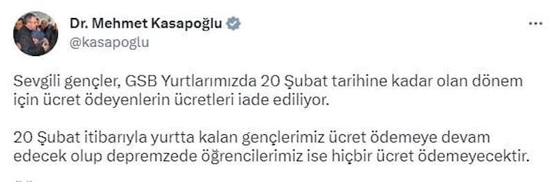 GSB yurtlarında 20 Şubat tarihine kadar olan dönem için ücret ödeyen öğrencilerin ödemelerinin iade edileceği, depremzede öğrencilerin ise hiçbir ücret ödemeyeceği açıklandı.