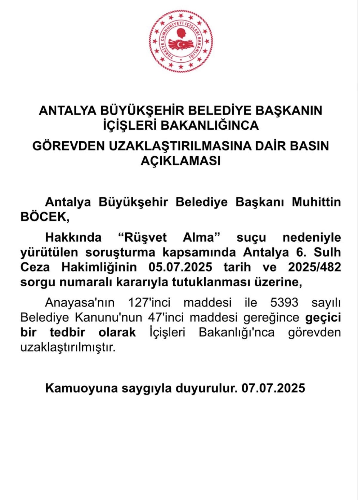 Antalya Büyükşehir Belediye Başkanı Muhittin Böcek, hakkında ‘rüşvet alma’ suçu nedeniyle yürütülen soruşturma kapsamında Antalya 6. Sulh Ceza Hakimliğinin 5 Temmuz 2025 tarih ve 2025/482 sorgu numaralı kararıyla tutuklanması üzerine Anayasa'nın 127'inci maddesi ile 5393 sayılı Belediye Kanunu'nun 47'inci maddesi gereğince geçici bir tedbir olarak İçişleri Bakanlığı'nca görevden uzaklaştırılmıştır.