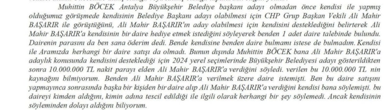 Antalya Büyükşehir Belediyesi'ne yönelik rüşvet soruşturması iddianamesinde adı geçen iş insanı Halil Tolga Ayvazoğlu fadesinde, Muhittin Böcek bana Ali Mahir Başarır’a adaylık konusunda kendisini desteklediği için 2024 yerel seçimlerinden sonra 10 milyon lira verdiğini söyledi.