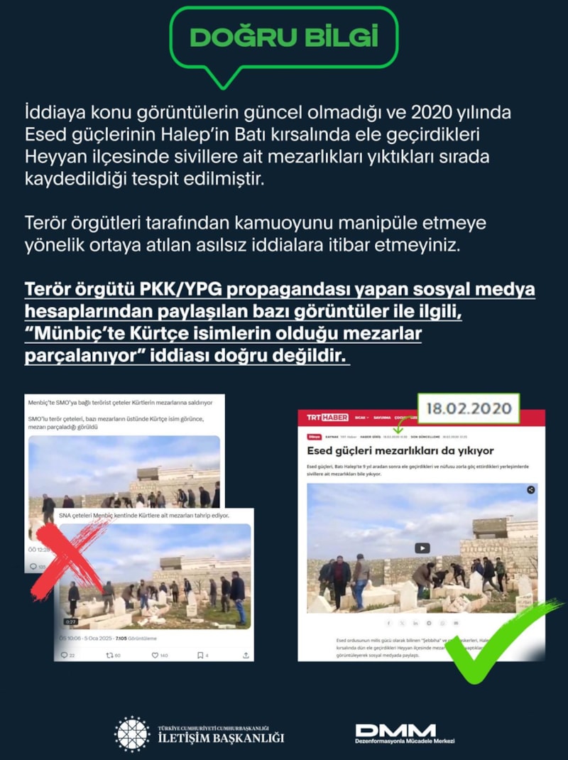 Dezenformasyonla Mücadele Merkezi, terör örgütü PKK/YPG propagandası yapan sosyal medya hesaplarından paylaşılan bazı görüntüler ile ilgili, “Münbiç'te Kürtçe isimlerin olduğu mezarlar parçalanıyor” iddiasının doğru olmadığını bildirdi.